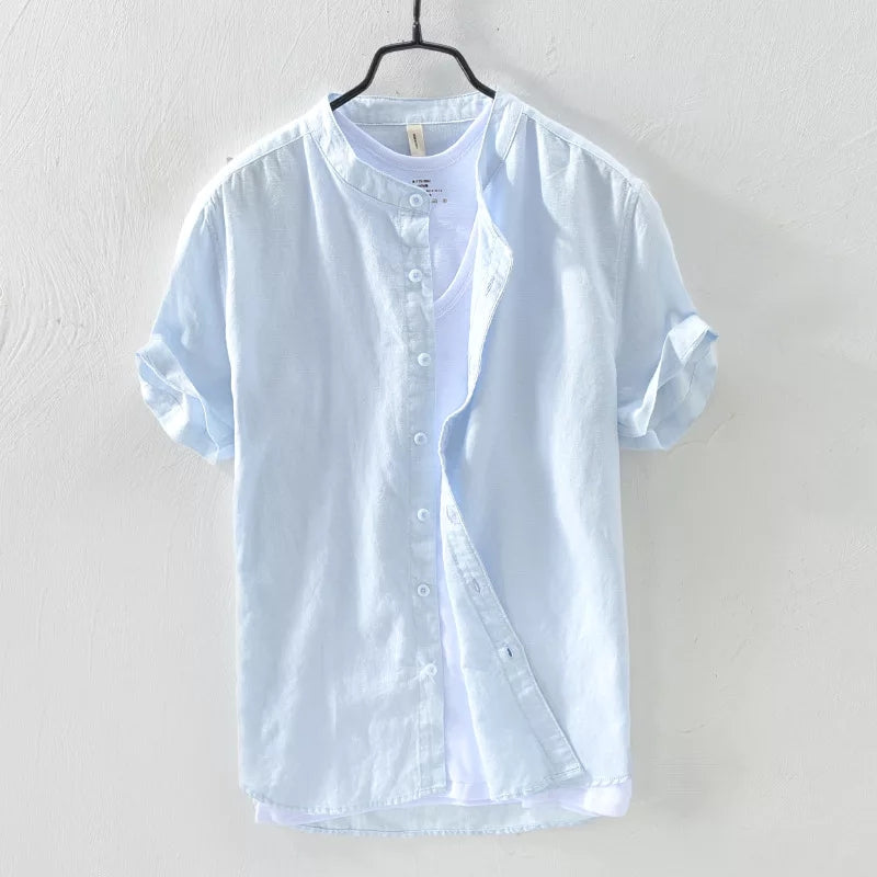 Sky Blue Mandarin Collar Linen Shirt--Short Sleeve